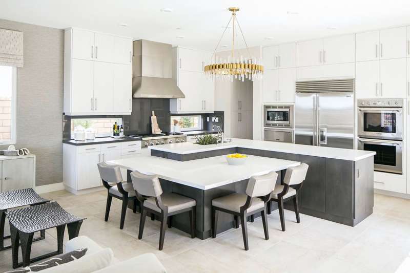 Разграничьте функциональные зоны на кухне: обеденная, рабочая и готовка. Используйте остров со столом для создания обеденной зоны.