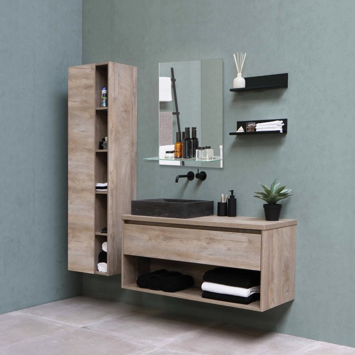 Для создания эффекта простора и отражения света установите полку с зеркалом возле источника естественного или искусственного освещения в ванной комнате.